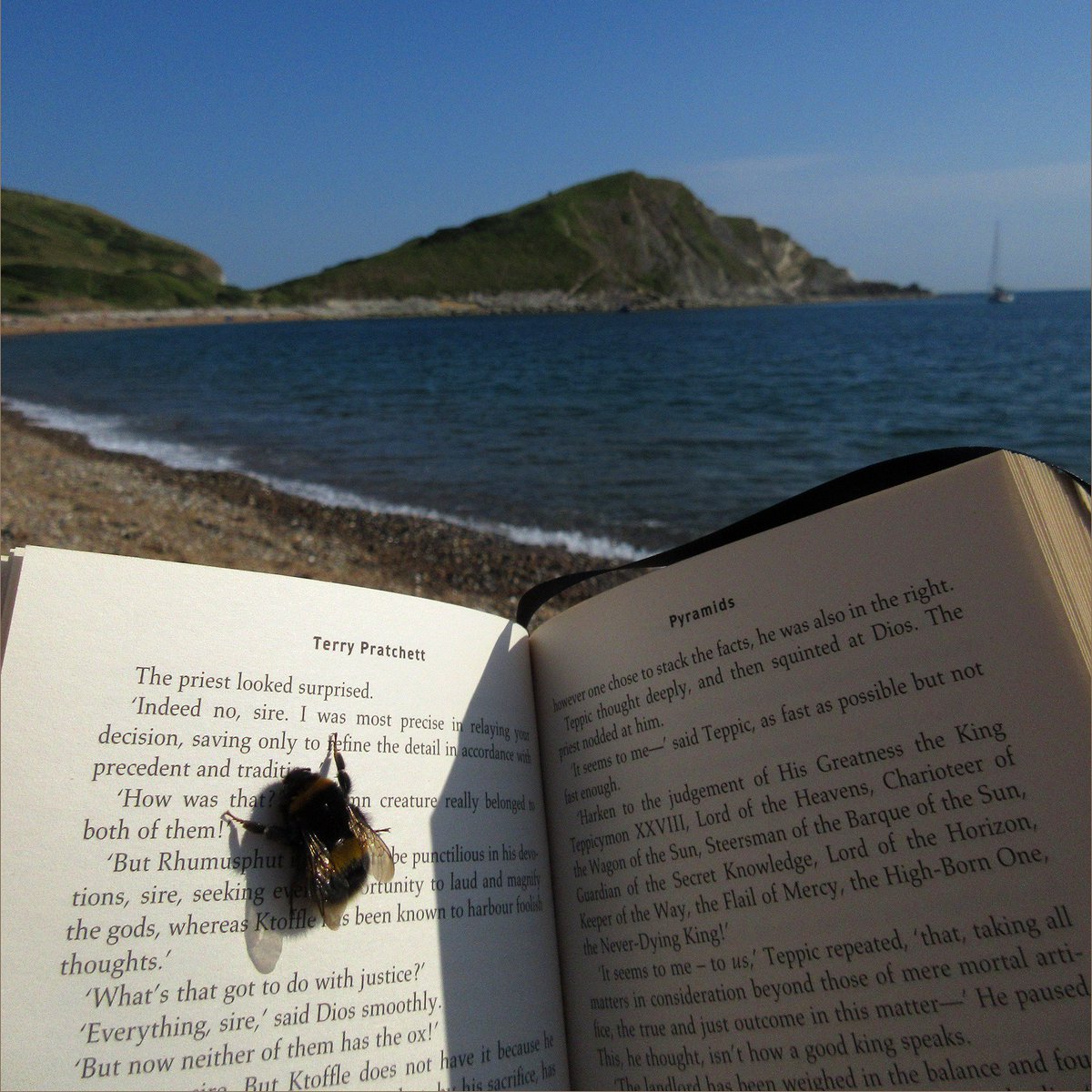 #DontStepOnABeeDay, and this beautiful bumble has decided to join in our summer read by resting on the pages of a Pratchett. What fine taste in literature this little creature has!