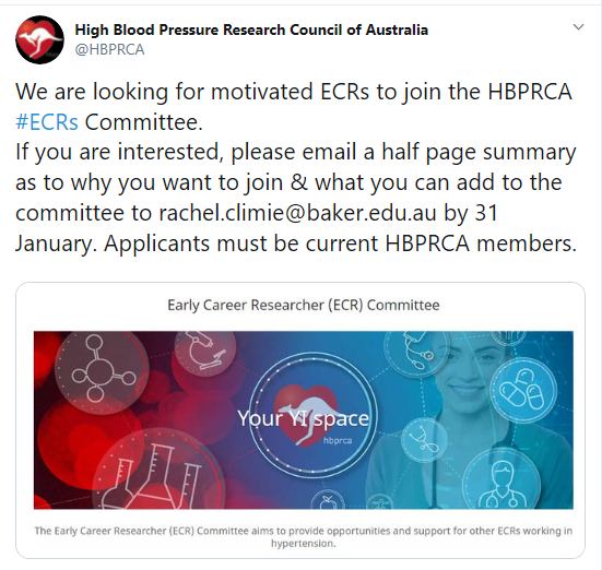 #ECRs Committee. If you are interested, please email a half page summary as to why you want to join & what you can add to the committee to rachel.climie@baker.edu.au by 31 January. Applicants must be current HBPRCA members. pic.twitter.com/wO17ktiNbL