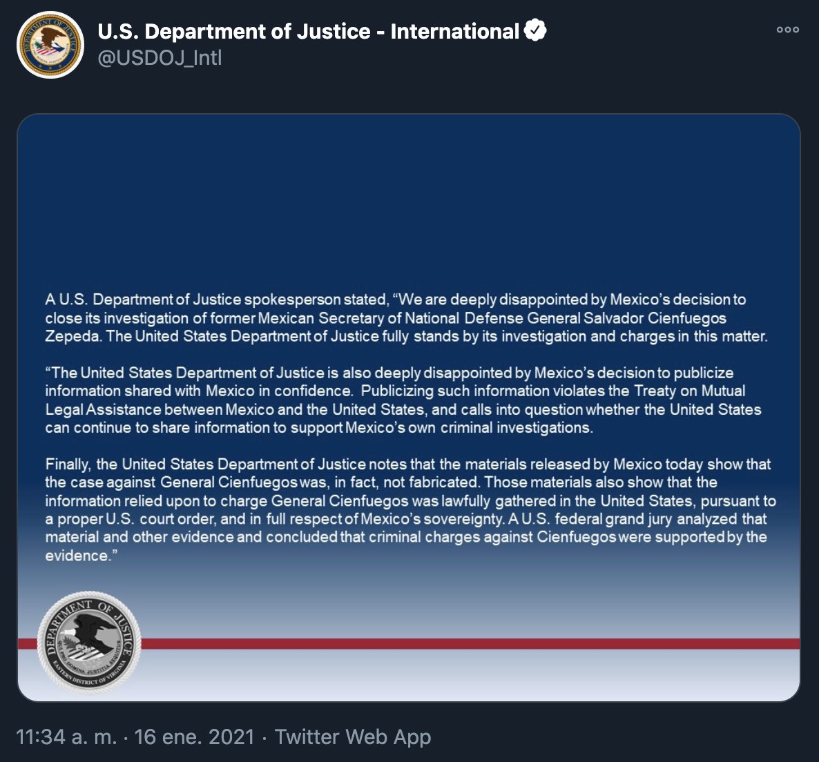 #EEUU se dijo “profundamente decepcionado” por la decisión de#México de cerrar su investigación contra el exsecretario de Defensa Salvador#Cienfuegos PMpic.twitter.com/g4uyuoLfDJ