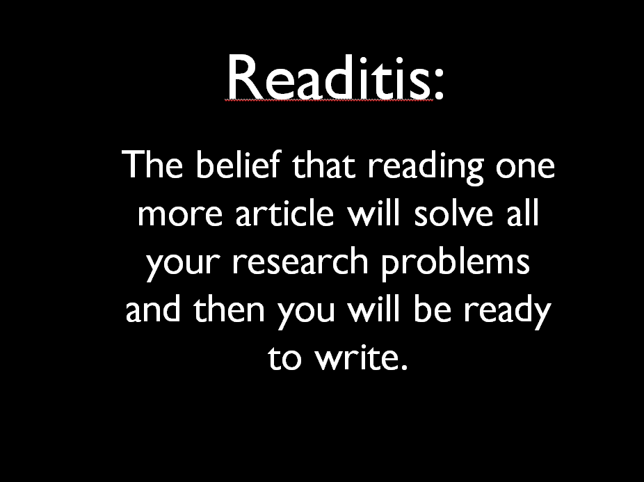 Readitis: The belief that after reading one more article you will be ready to write. There is no end to how much you can read. So write first, then read some, write, read, repeat.