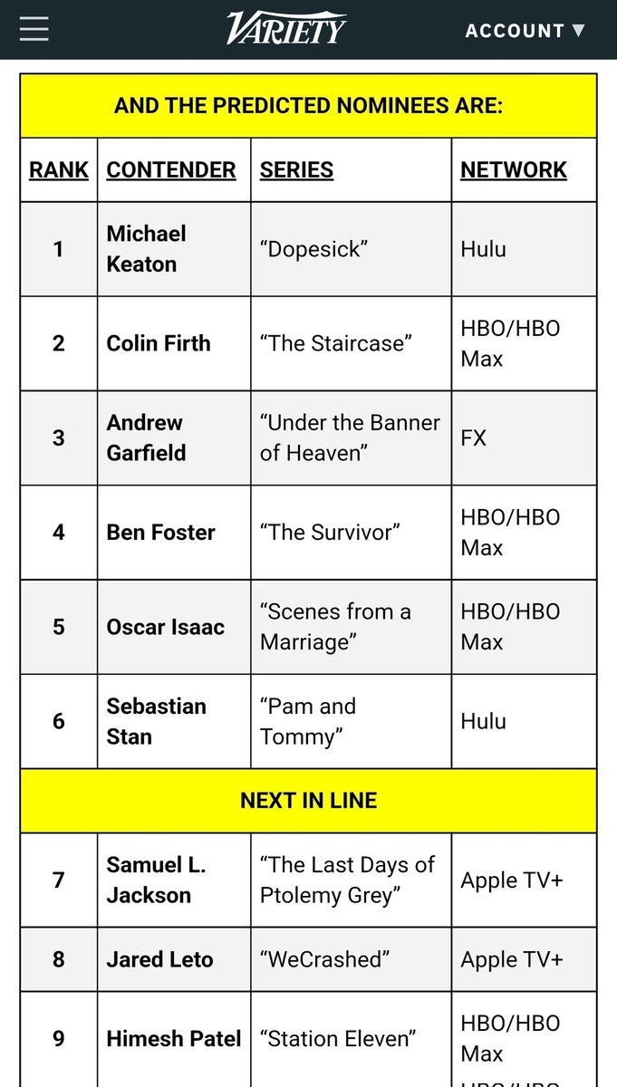 Emmy Predictions: Lead Actor in a Limited Series or TV Movie "Oscar Isaac will be pulling double duty with Marvel’s “Moon Knight” and HBO’s “Scenes from a Marriage,” the latter of which is a stronger awards play." https://variety.com/feature/2022-emmy-predictions-lead-actor-limited-series-1235232870/ … via