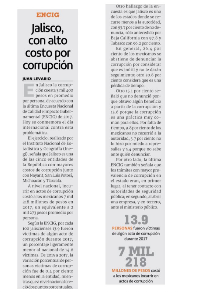 #corrupción son frecuentes o muy frecuentes en el estado.#ENCIG señala que Jalisco es una de las 5 entidades de la República con mayores costos de corrupción. La corrupción cuesta $3,400 pesos en promedio por persona. pic.twitter.com/0AVWm4Sbtm