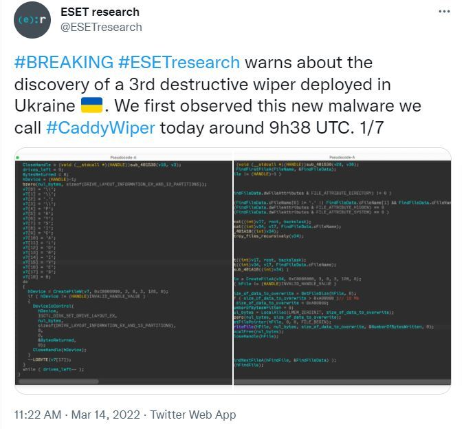 @ESETresearch find new destructive wiper malware in#Ukraine#CaddyWiper#ESETresearch https://www.theverge.com/2022/3/14/22977873/ukraine-new-destructive-caddywiper-malware-eset … via@Verge -