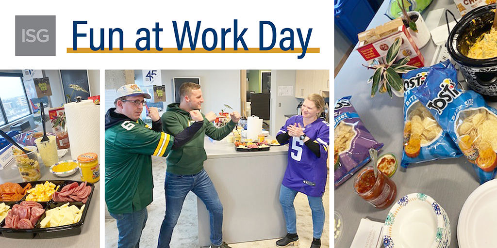 #FunatWorkDay in full effect, we’ve decided this week’s#EmployeeSpotlight should be on our 315+#ISGEmployeeOwners, endless innovation, and continual shenanigans!#SuperBowl2020#workhardplayhard#ESOP pic.twitter.com/cwBtxdyqYy