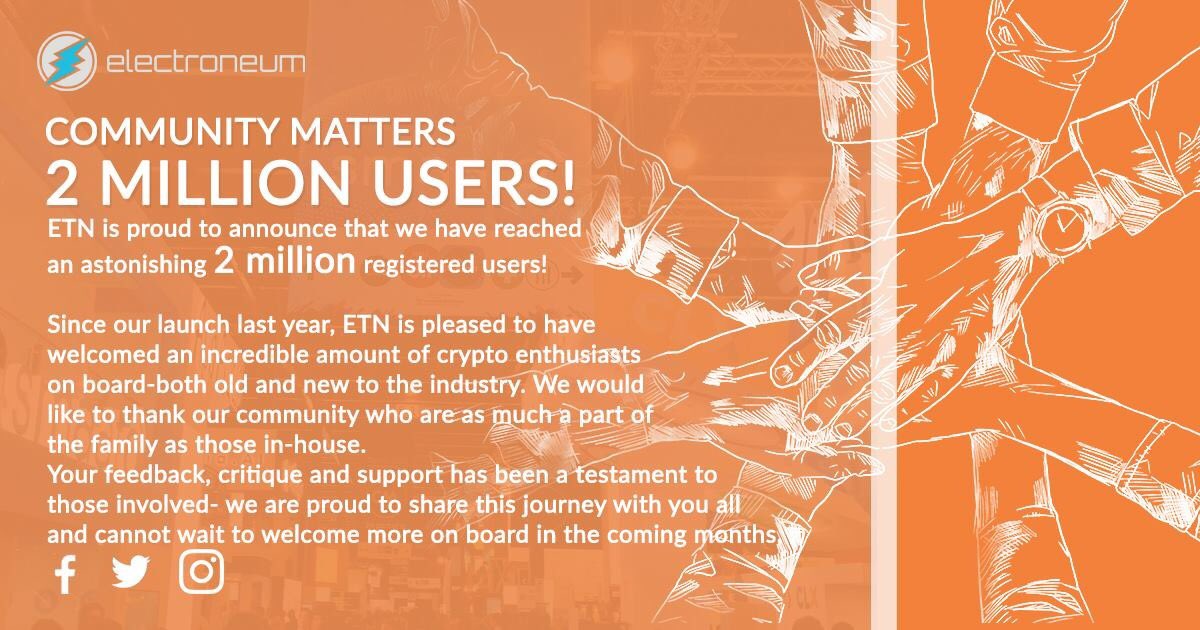 #Electronium community just hit a record breaking milestone of Two million users. That is 2 mill users who: ☆ Supports massive adoption of#Crypyo. ☆Trust the Secured mobile payment of the#ETN platform ☆ Believes and have faith in the ETN project and roadmap.#ETN242 -