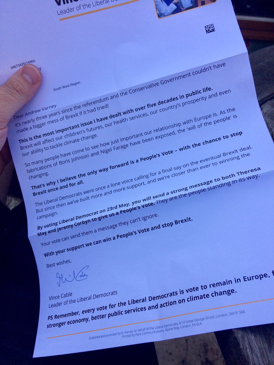 @LibDems for the#EUEelections2019. We want to stop Brexit as we believe Britain will be more prosperous in the EU, and we will be better able to tackle climate change and protect our public services. If you agree,#VoteLibDem on 23 May.pic.twitter.com/hpl0wVfUif