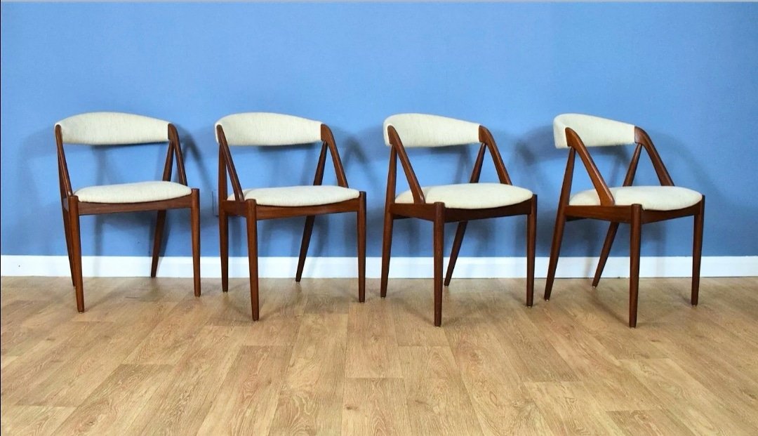 Timeless set of Kai Kristiansen Model 31 dining chairs, in Teak and Oatmeal Wool, fresh in! . . . . .