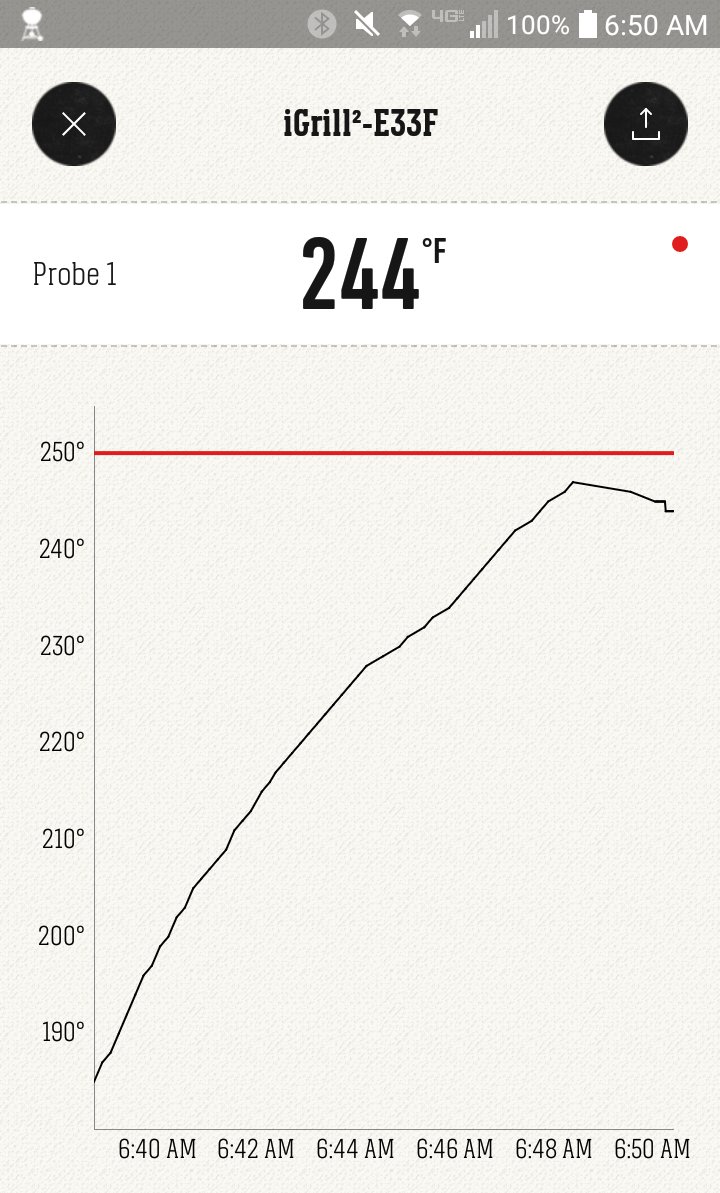 #EconCookingTwitter: bluetooth temperature probe. Turns out the smoker's built in probe is a bit off. Not to worry, 250 is at the high end for this one. pic.twitter.com/XiNSdvnrWw
