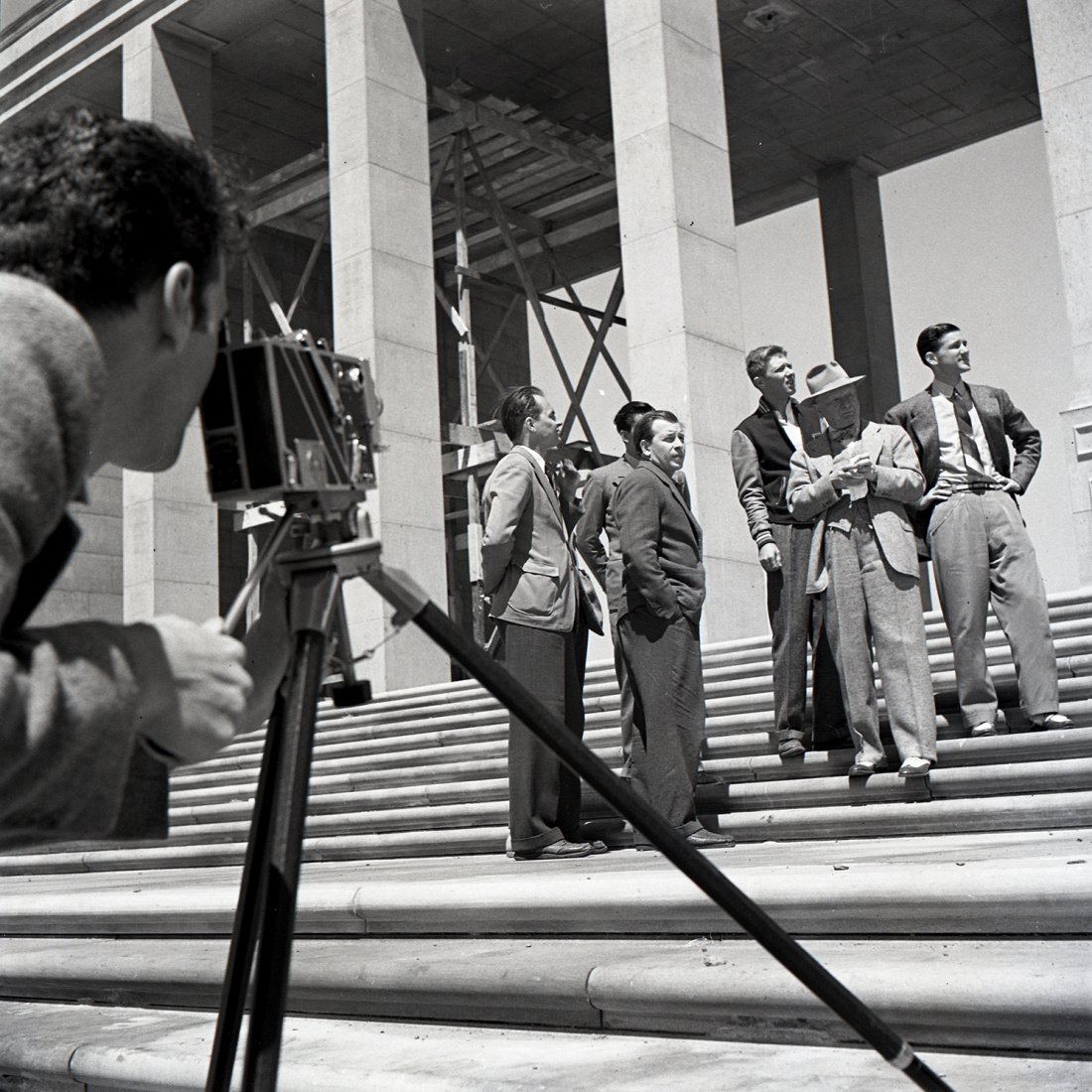 #EeroSaarinen, architect, designer, and close friend of Charles and Ray. In this 1941 image, Charles is behind a camera, photographing Eero and others on the steps leading to the#Cranbrook library.pic.twitter.com/bKM9ZfaqhS