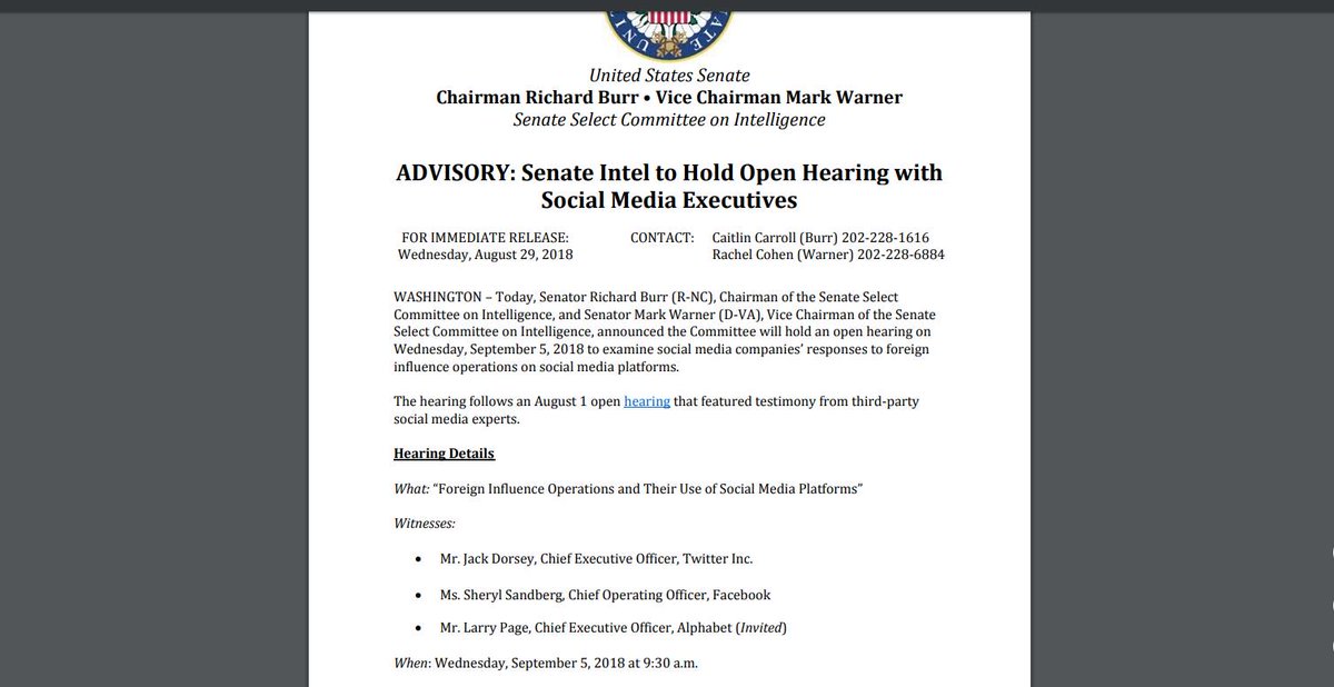 Larry Page will join Facebook's Sheryl Sandberg and Twitter's Jack Dorsey in testifying before the Senate Intelligence Committee on