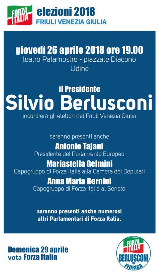 #Udine con@berlusconi,@Antonio_Tajani,@msgelmini e@BerniniAM per sostenere il candidato alla regione#Friuli,@M_Fedriga!#centrodestra#elezioni2018#elezionifvgpic.twitter.com/pPAFnw7dvE