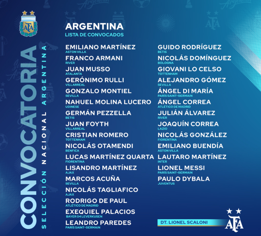 #Eliminatorias Listado de jugadores convocados de la Selección Argentina para la triple jornada Eliminatoria rumbo a Qatar2022 , retorna Paulo Dybala