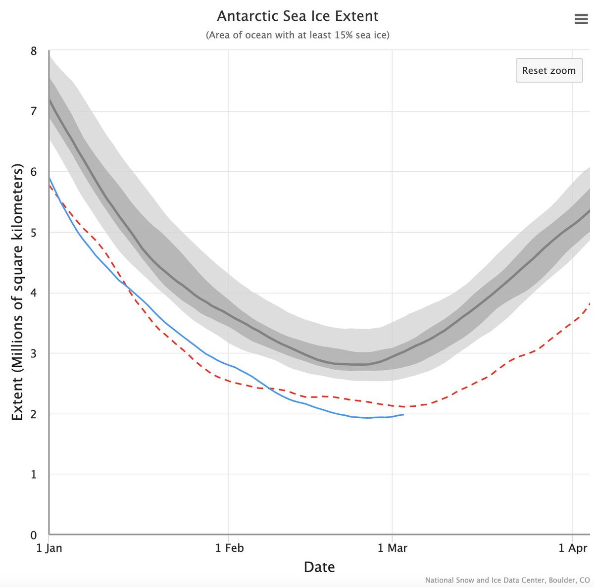 #EmergênciaClimática: Mais um triste recorde do clima estabelecido! A cobertura de gelo marinho ao redor da Antártica atingiu, nos últimos dias, os menores valores do registro histórico. Fonte:@NSIDC