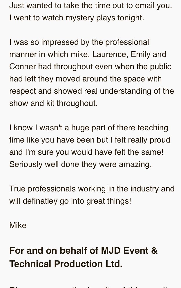 Some fantastic feedback from an employer regarding our Technical Theatre students