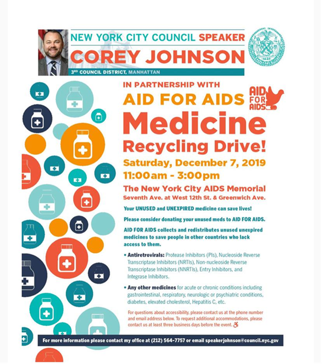 Aid for AIDS - Medicine Recycling Drive Saturday, December 7, 11AM-3PM 7th Avenue & 12 Street & Greenwich Avenue Contact 212-564-7757 or email speakerjohnson@council.nyc.gov