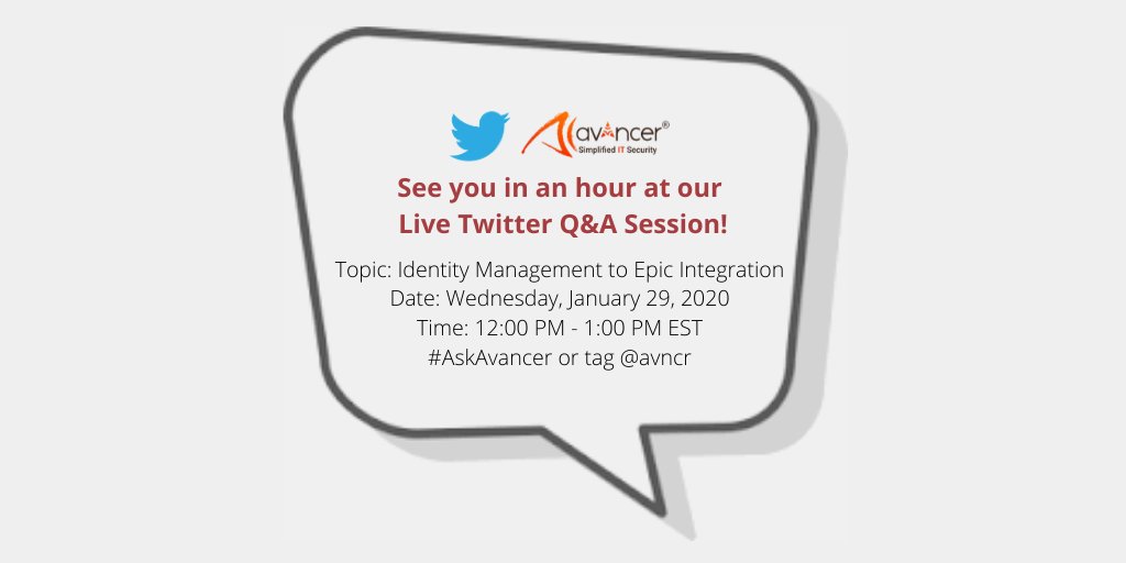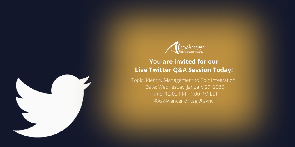 #TwitterQnA Session Today at 12:00 PM EST! Tweet your questions on#IdentityManagement to#Epic Integration with#AskAvancer or/and tag@Avncr.#Epicsystems#Healthcare#HIPAA#IAM#Cybersecurity#TwitterChat https://zurl.co/fV13 pic.twitter.com/ZSZcS23JL6