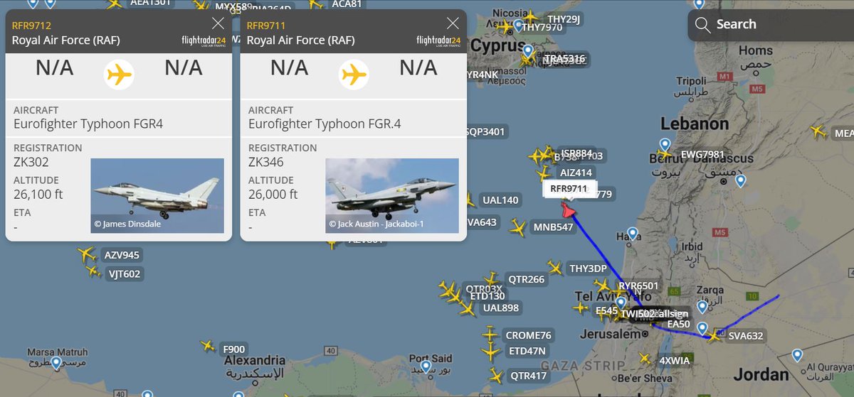 #RAF#Eurofighter#Typhoon jets passed over Israel not too long ago. The 2 planes were visible over Jordan, and now heading NE.pic.twitter.com/h1jI75AsIB