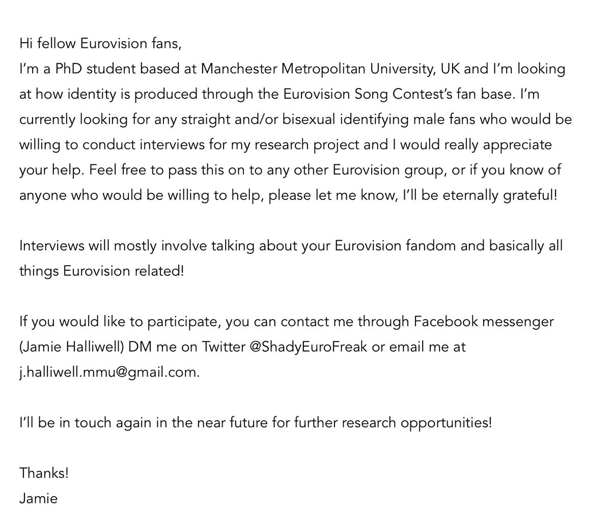 #Eurovision fans if you can retweet this far and wide, I'd be so grateful! Looking for research participants! :D#PhDResearchpic.twitter.com/HntfRK9J5F