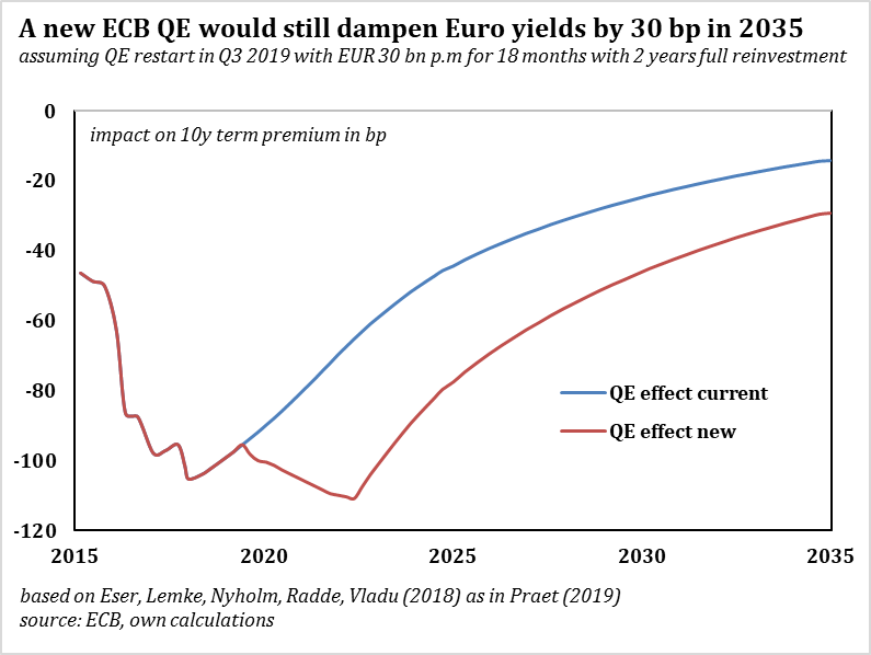 Should ECB restart bond purchases, dampening effect on yields will be further intensified. Term premium of 10y bonds is already depressed by 90 bp. In 2035 effect still estimated at -15 bp. With a new program, effect could be -30 bp in 2035.