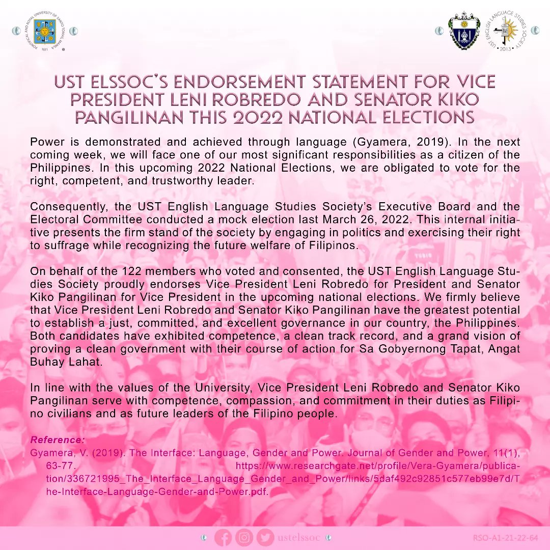 To our journey in achieving a better future for our country, the English Language Studies Society officially endorses the tandem of VP Leni Robredo & Sen. Kiko Pangilinan for the upcoming National Elections 2022.