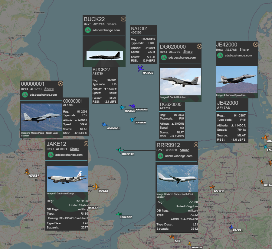 It looks like a bones day. F-15 BONES42 flight path shown east of England, another F-15 flying over Wales, and an Osprey to the north.