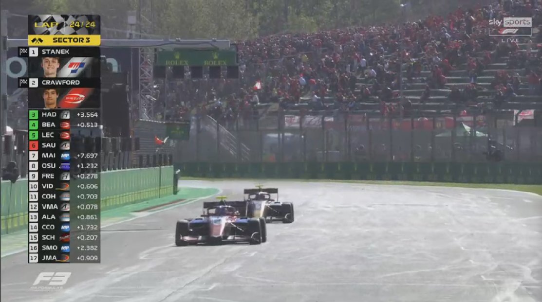 There's carnage in the last corner as Saucy tries to make a move past Bearman, but the Prema driver just lost the rear end and took out the ART driver! That hands Hadjar P3, as Roman Stanek crosses the line to take victory in the Feature Race!
