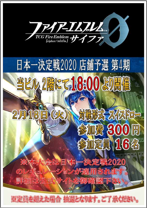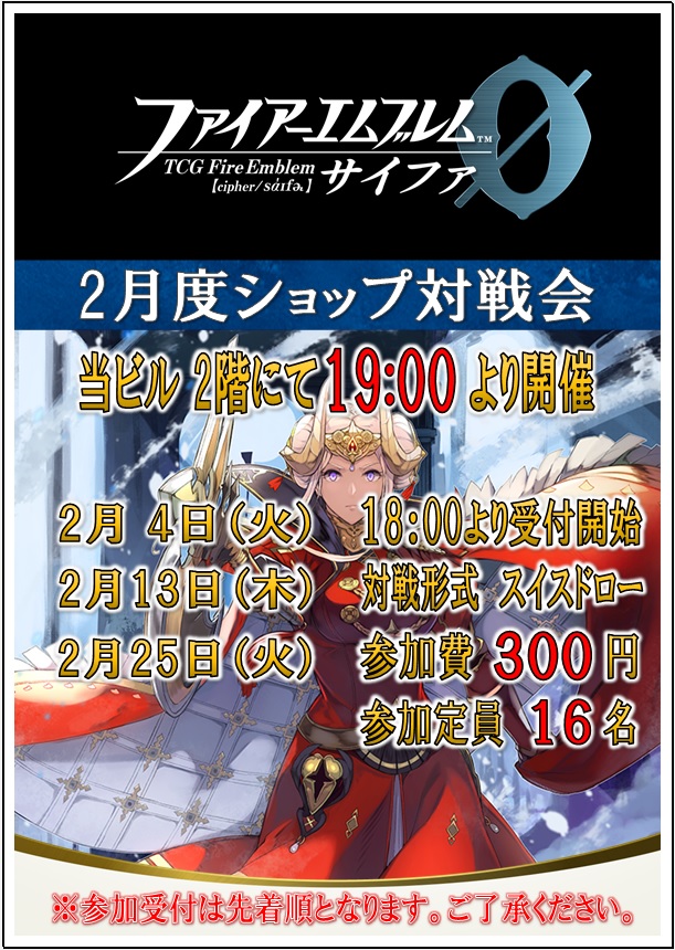 【ファイアーエムブレムサイファ】 大会情報 ・来週のショップ対戦会は2/13(木)開催となります。 火曜日ではございませんのでご注意ください。 また2/18(火)は店舗予選開催の為 対戦会はお休みとなります。 ご了承下さい。