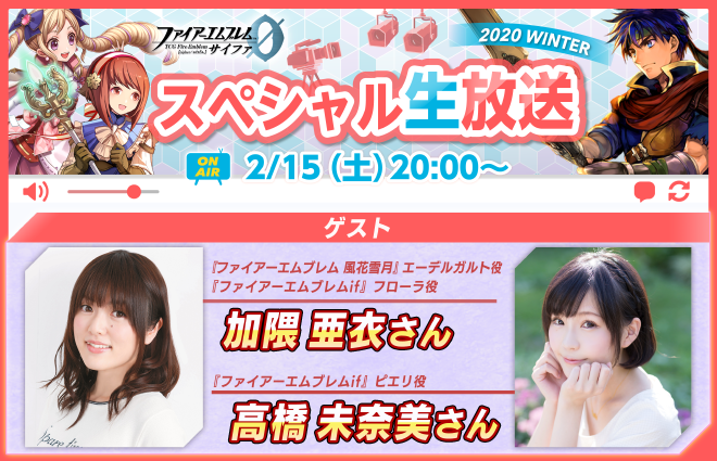 The Special Live Broadcast, Winter 2020, will air on Tuesday the 15th of February. With guest host Minami Takahashi (voice of Peri) and guest Ai Kakuma (voice of Edelgard and Flora), we'll be bringing you the latest news. (1/2)