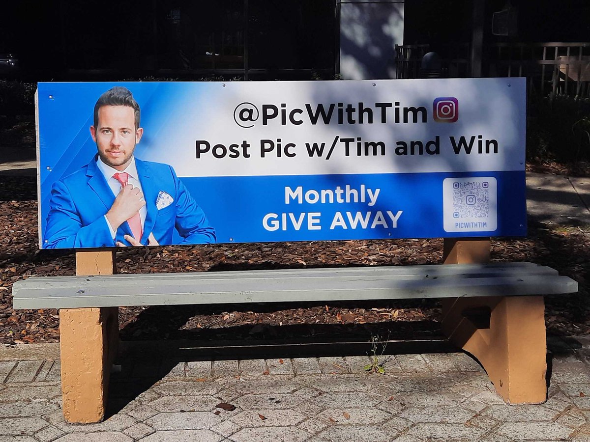 This is a fun way to grab peoples attention! Tim Horvath is using his bench sign as a marketing tool for a giveaway. Take a creative pic with the bench and you'll be entered to win a prize each month. He has 1 sign in