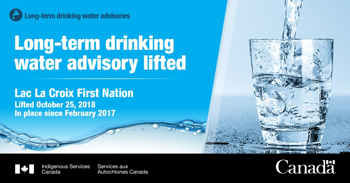 La Première nation de Lac La Croix a levé un avis à long terme sur l'eau potable en vigueur depuis février 2017. Les réparations et les améliorations apportées au système de traitement de l'eau ont permis à la communauté de disposer d'eau potable saine et propre.