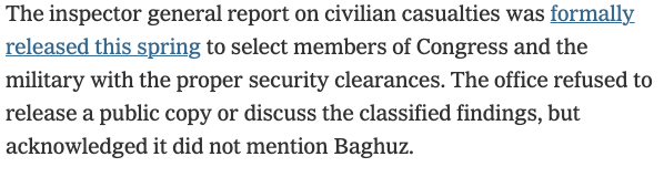 NEW: Last month, NYT pubbed a bombshell story abt how the US hid the number of civilian casualties following an airstrike in Syria. The story noted that DOD IG refused to release a public copy of a classified report on civilian casualties So I