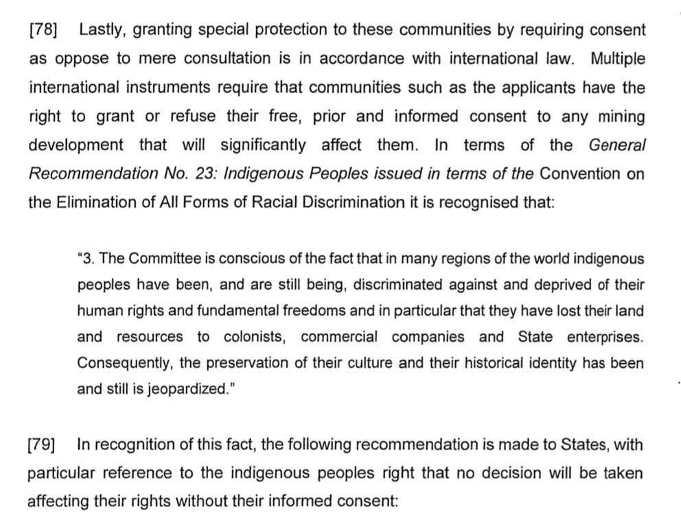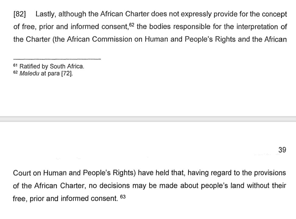 #FPIC. It grounds this finding not in ILO 169, but on four treaties that are in fact binding on SA: 1. African Charter on Human and People's Rights 2. CERD 3. ICESCR 4. ICCPR pic.twitter.com/6aQSGL7Jrh