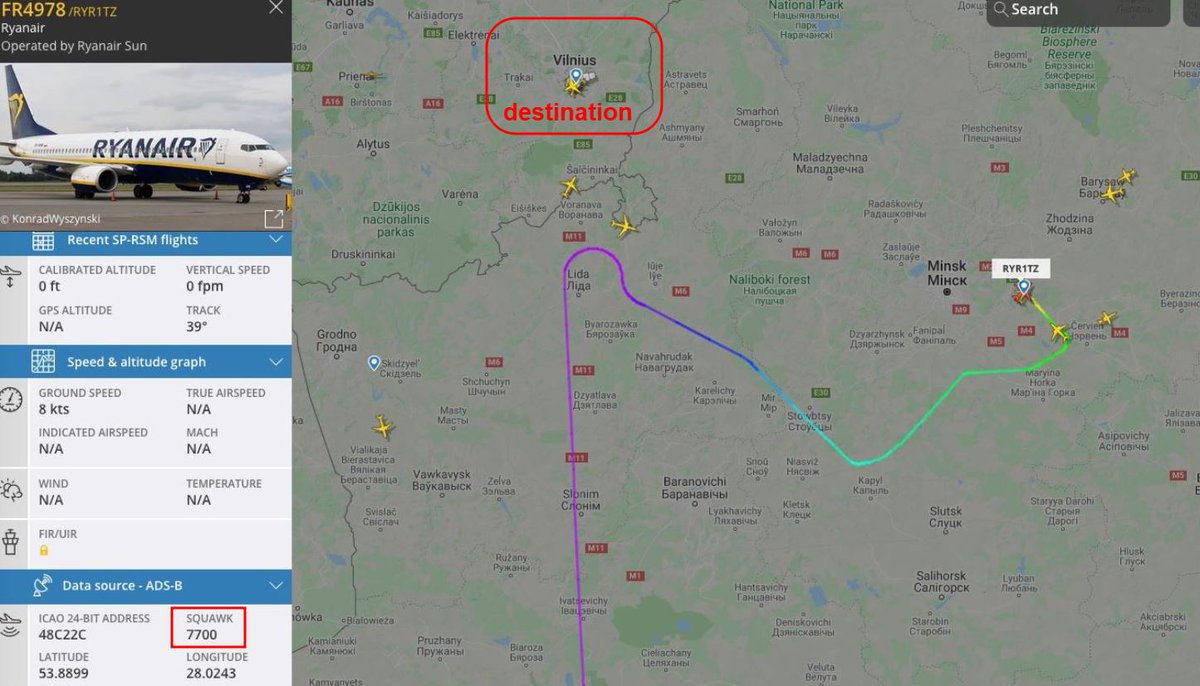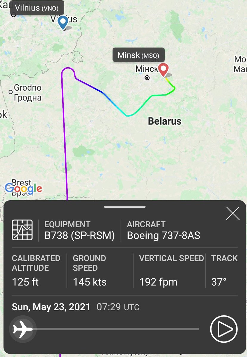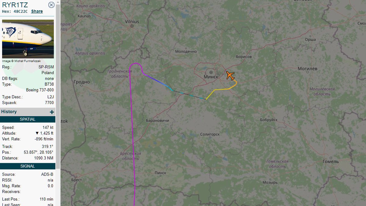 #FR4978 / SP-RSM events today (UTC time). 07:29 Take off from Athens 09:46 Diversion started 10:16 Landed in Minsk 17:47 Take off from Minsk 18:26 Landed in Vilnius pic.twitter.com/2njOuGfQ1P