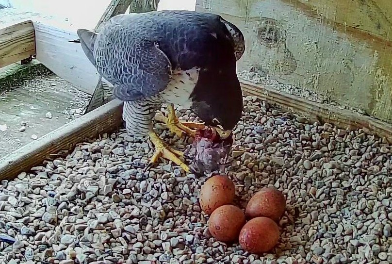 The Rochester Falcons continue to incubate their 4 eggs this morning. Nova left, Neander right. Stay tuned!