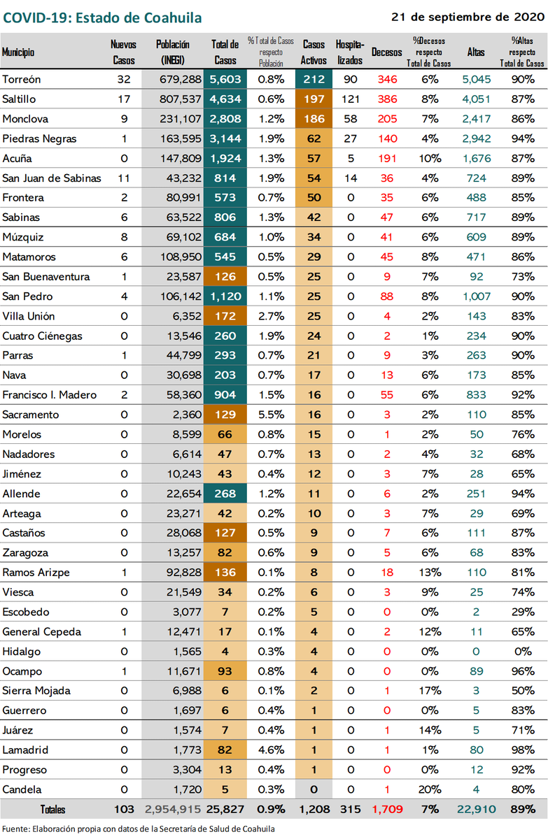 #Coahuila al 21 de#Sept | Positivos#Covid19 25,827; municipios más afectados:#Torreon 5,603 (+346)#Saltillo 4,634 (+386)#PiedrasNegras 3,144 (+140)#Monclova 2,808 (+205)#Acuña 1,924 (+191)#Fallecidos total +1,709, Gráfico@monsecantugtz https://m.facebook.com/story.php?story_fbid=3470615649628156&id=100000392643942 …#RTNewspic.twitter.com/l3lDuLXUGd