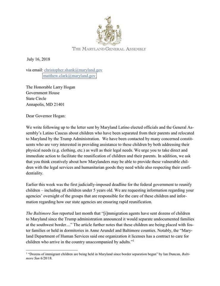 Wow. 32 Maryland state legislators just sent Larry Hogan this detailed letter (read it!) calling him out for not doing anything to reunify the children Trump separated from their parents and sent to MD. Hogan could—and SHOULD—be doing more for these kids.