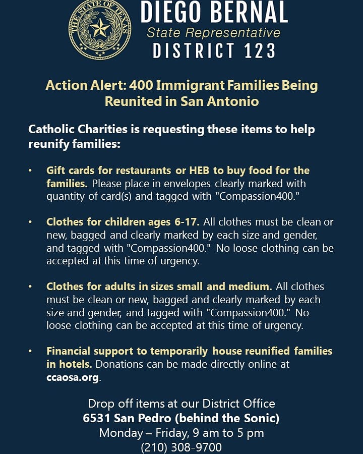 SA is one of four cities where separated families will be reunited. We're working with Catholic Charities to collect donations for the parents & children. Repost, retweet, etc.