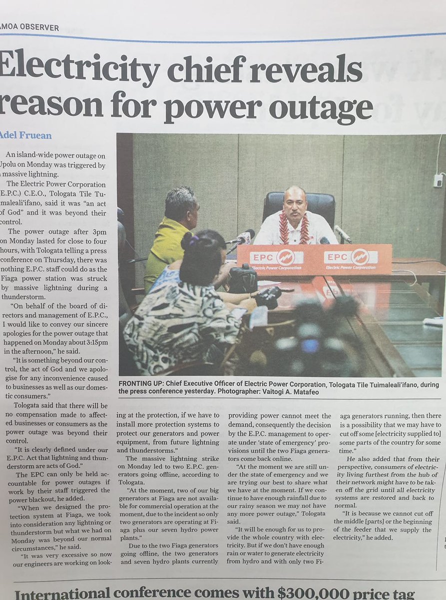So an "act of God" by way of lightning caused the power outage... meanwhile somewhere in the hills of Vailima, man is building a hydro dam that is said to withstand a 1 in every 200 year flood