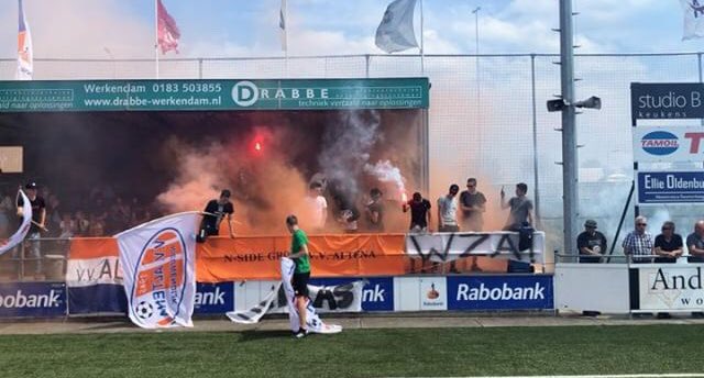 VV Altena supporters met een Sfeeractie tegen SV Capelle afgelopen Zaterdag (Promotie/Degradatie Voetbal 2e/3e Klasse)