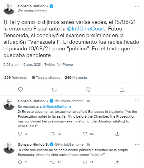 El vicepresidente del @ForoPenal, Gonzalo@HimiobSantome, explicó que el 15/06/21 la entonces Fiscal ante la@IntlCrimCourt,#FatouBensouda, sí concluyó el#ExamenPreliminar en la situación “Venezuela I” y luego las reclasificaron como "públicas" el 10/08/21.#TVVpic.twitter.com/IrfMAwiycZ