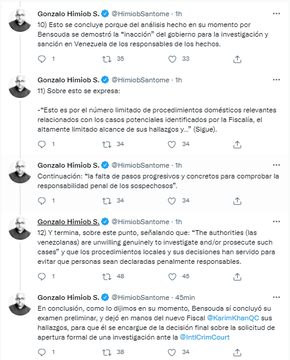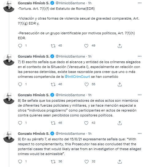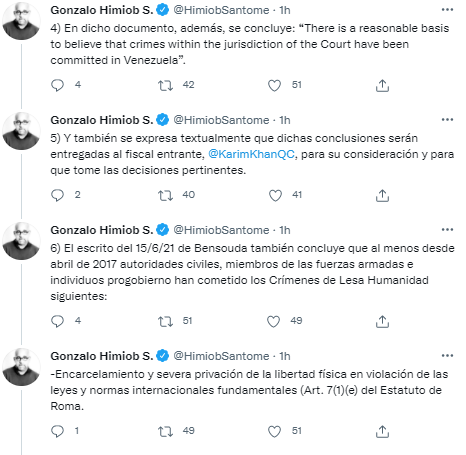 En el documento de la @IntlCrimCourt que se ha hecho público de la ex-fiscal#FatouBensouda, se confirma lo que ya sabemos: en#Venezuela se han cometido crímenes de lesa humanidad en total impunidad. Ahora solo falta que el fiscal@KarimKhanQC de apertura a la investigaciónpic.twitter.com/SrrjXDjN7r