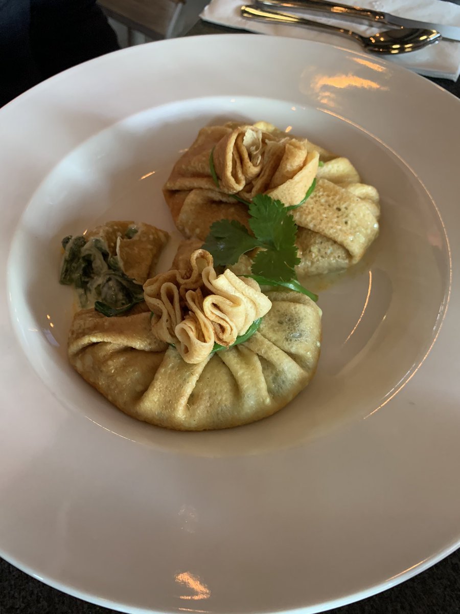 Had poblano and Gorgonzola stuffed crepes this morning. Never have had a crepe tied like this.