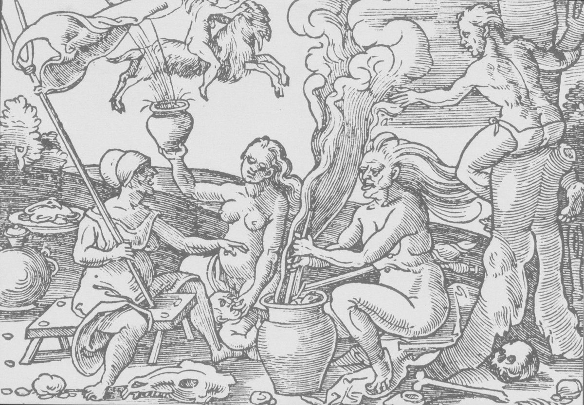Witches flew by a magic salve, prepared and rubbed on objects, including their bodies. Many lists exist, causing hallucination and poisoning, but Francis Bacon's recipe was the fat of dead children, celery juice, crushed wolfsbane and cinque foil, with wheat meal