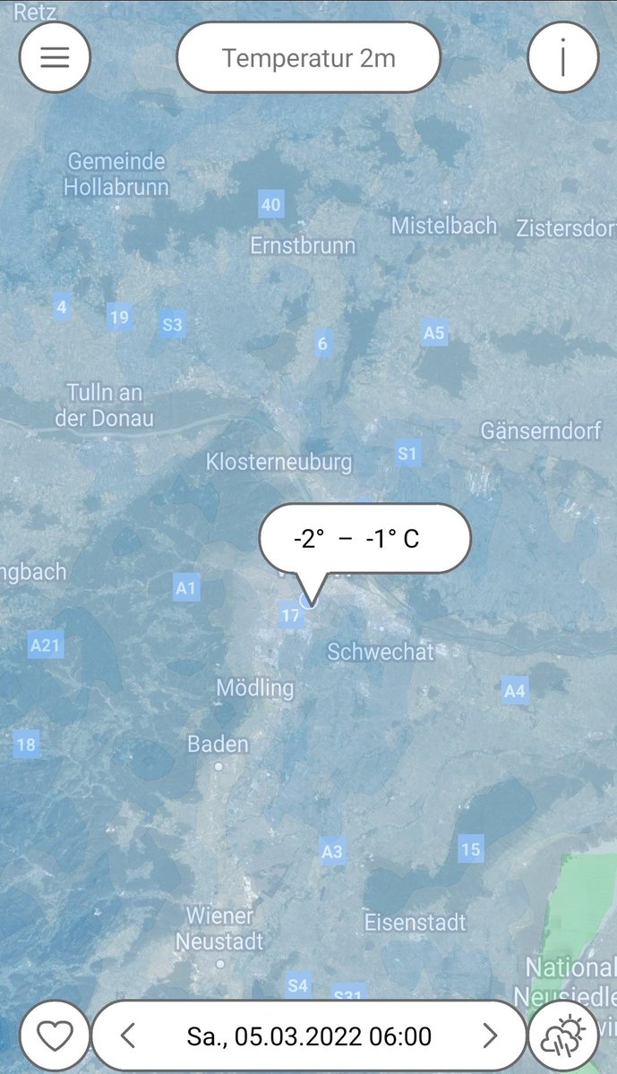 #Montag aus#Wien#Favoriten. Wir liegen am Rande einer Hochdruckzone in einer nordöstlichen Strömung und so wird kalte Luft zu uns geführt. Nach frostigen Start gibt es heute immer wieder Wolken und der Nordwind bläst zeitweise recht kräftig. Höchstwerte zw. 3-5°C pic.twitter.com/QsoA33FnQl