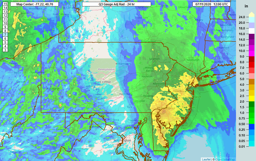 24- hour rain-gauge adjusted rainfall estimates: Particularly painful for thirsty lawns and gardens in a slice of central PA. Heavy rain from
