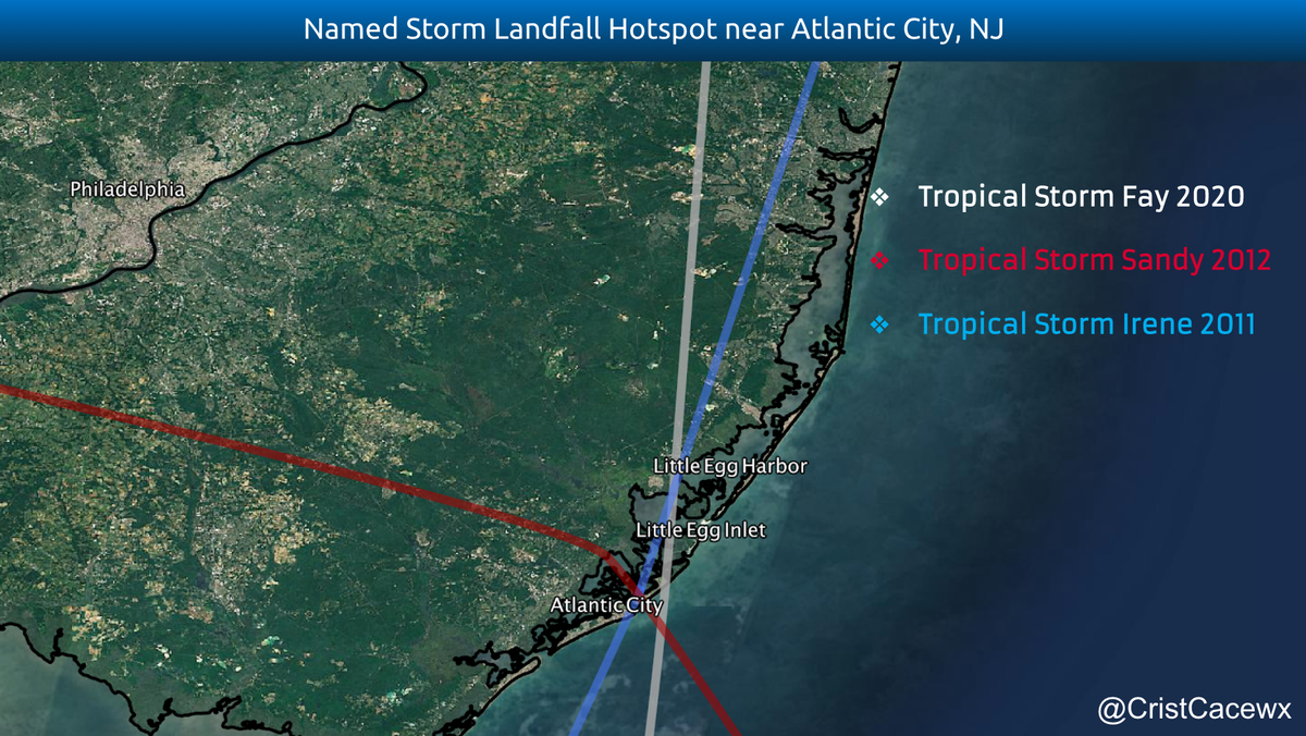 #Fay officially made landfall yesterday north of Atlantic City, New Jersey. This means that the last 3 named storms to make landfall in NJ, have done so in a region between Atlantic City and Little Egg Inlet.#wxtwitter#njwxpic.twitter.com/469wio9tzy