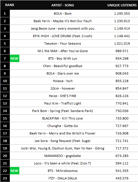 'Boy With Luv' by #BTS had 934,298 Unique Listeners in the 1st 24 hours on MelOn!#방탄소년단#MAP_OF_THE_SOUL_PERSONA#작은것들을위한시#BoyWithLuv#Feat_Halsey pic.twitter.com/VrA1G3d56Y