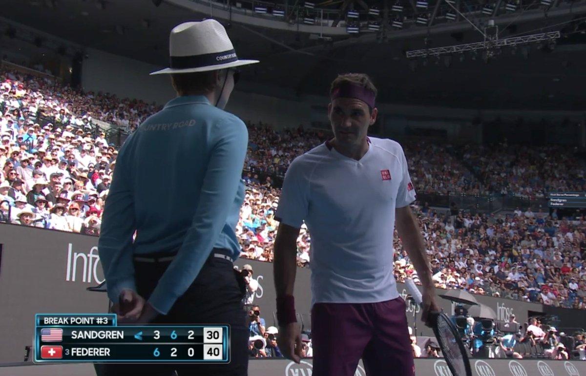 #Federer receives a warning for an audible obscenity - and safe to say he doesn't agree... To make matters worse, he's just let slip of 0-40 on Sandgren's serve... pic.twitter.com/vOAc8Vg7K4