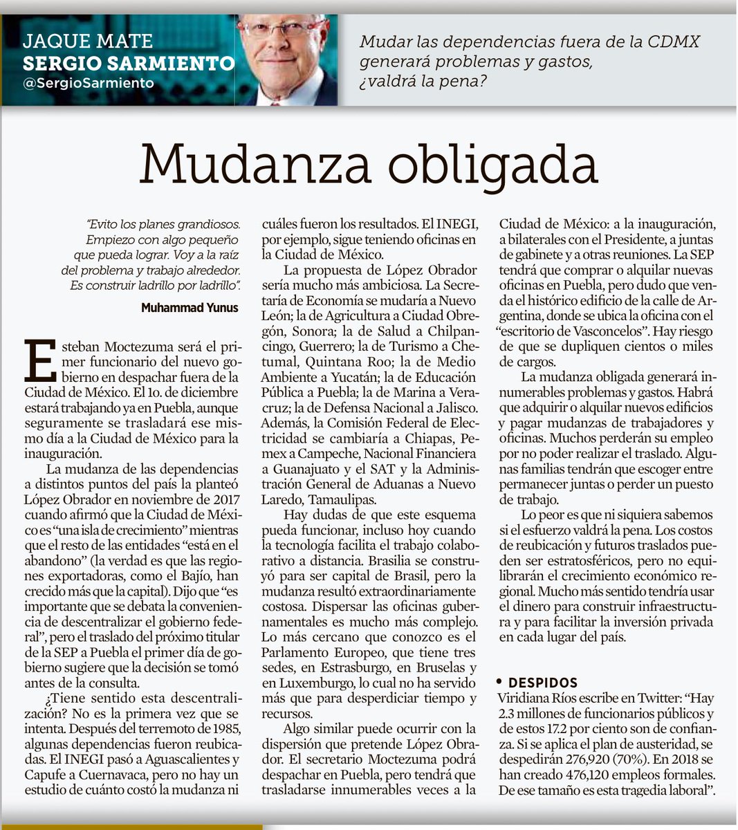 @SergioSarmiento en@Reforma sobre la ocurrencia de@lopezobrador_ de mandar secretarías de Estado, entidades paraestatales y empresas productivas del Estado al interior del país. No tiene pies ni cabeza. Léanlo.#FelizMartes pic.twitter.com/PM9NKI9KZn