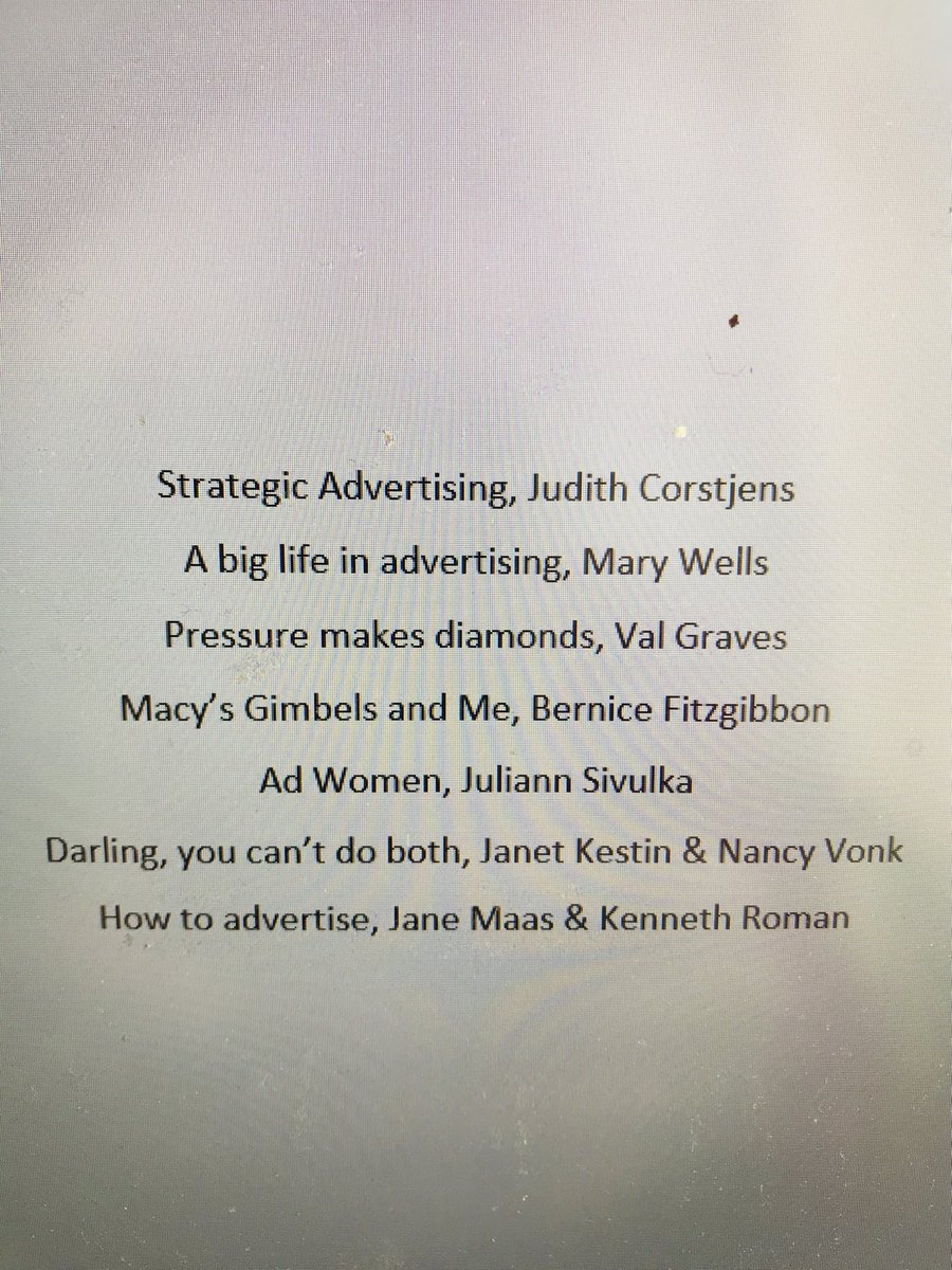 I have just purchased 'How to advertise' written by Jane Maas, because I want to read books on advertising by women. I want to be able to quote women. Because the world of advertising belongs to women too. That is all.